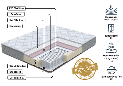 В составе комфортных слоев неолатекс в сочетании с эко ППУ с одной стороны и Би-кокос с другой стороны матраса. Защитным слоем при их взаимодействии с независимыми пружинами служит спандбонд.