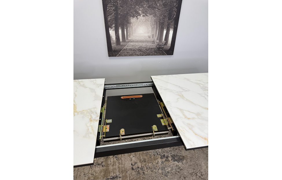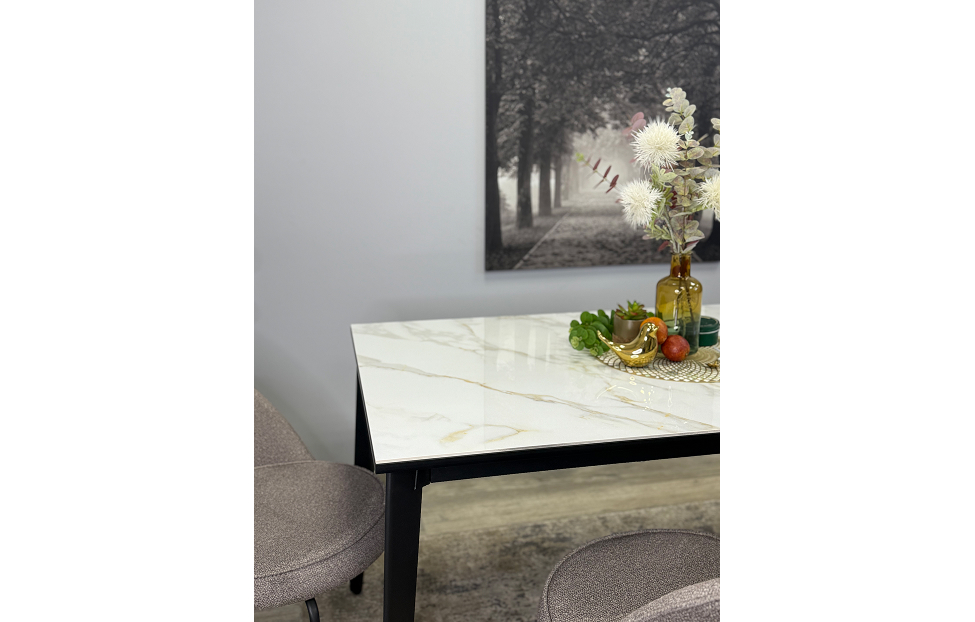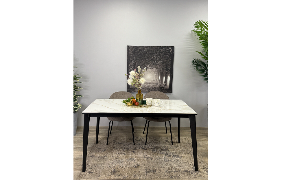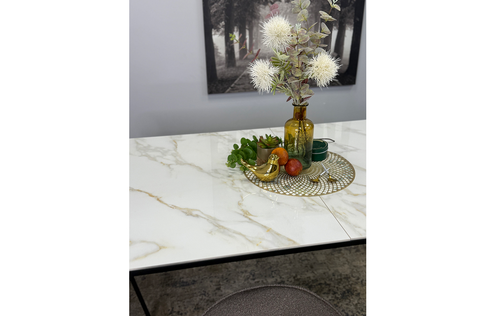 Стол обеденный Дега раздвижной KR1400 – стильный и практичный стол с керамической столешницей, которая отличается высокой прочностью и долговечностью. Каркас выполнен из стального профиля и окрашен в черный цвет, который гармонично сочетается с глянцевой поверхностью керамики.
