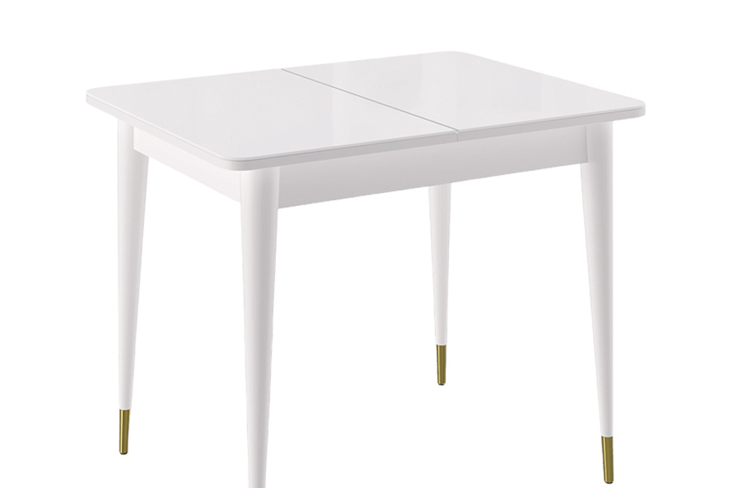 Стол обеденный Мане прямоугольный раздвижной К1100 опоры белого цвета с металлическими наконечниками, столешница - стекло белый глянец.