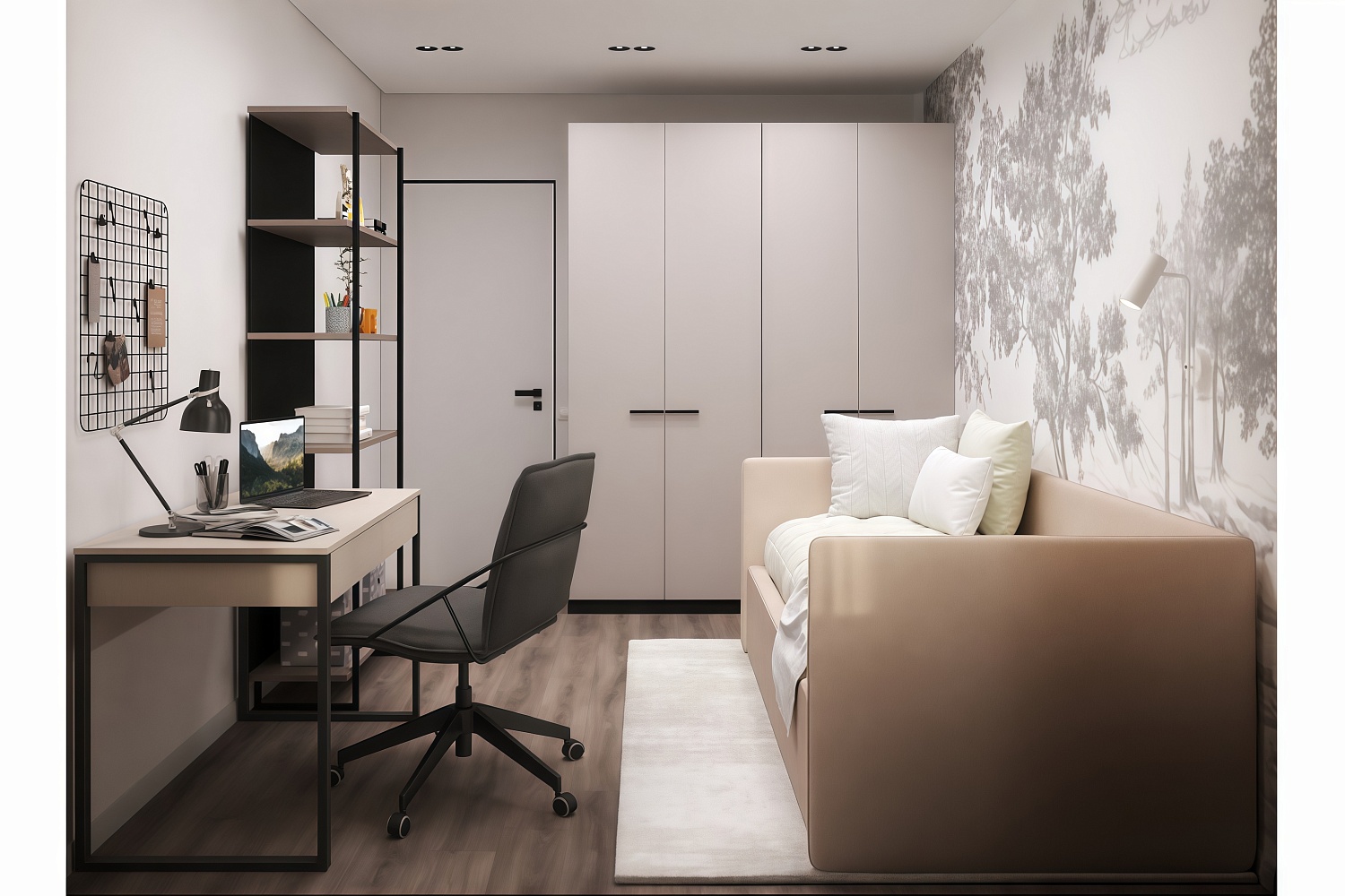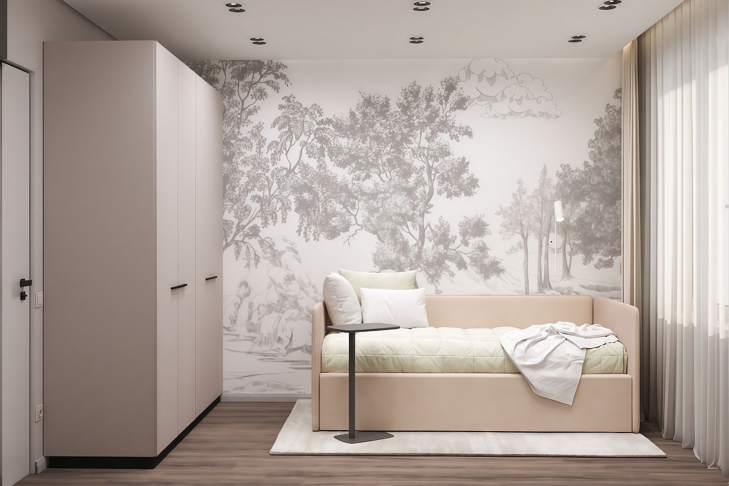 – описание: стиль современный, минимализм, цвет кашемир серый, назначение для дома, размер спального места 90 х 200 см.