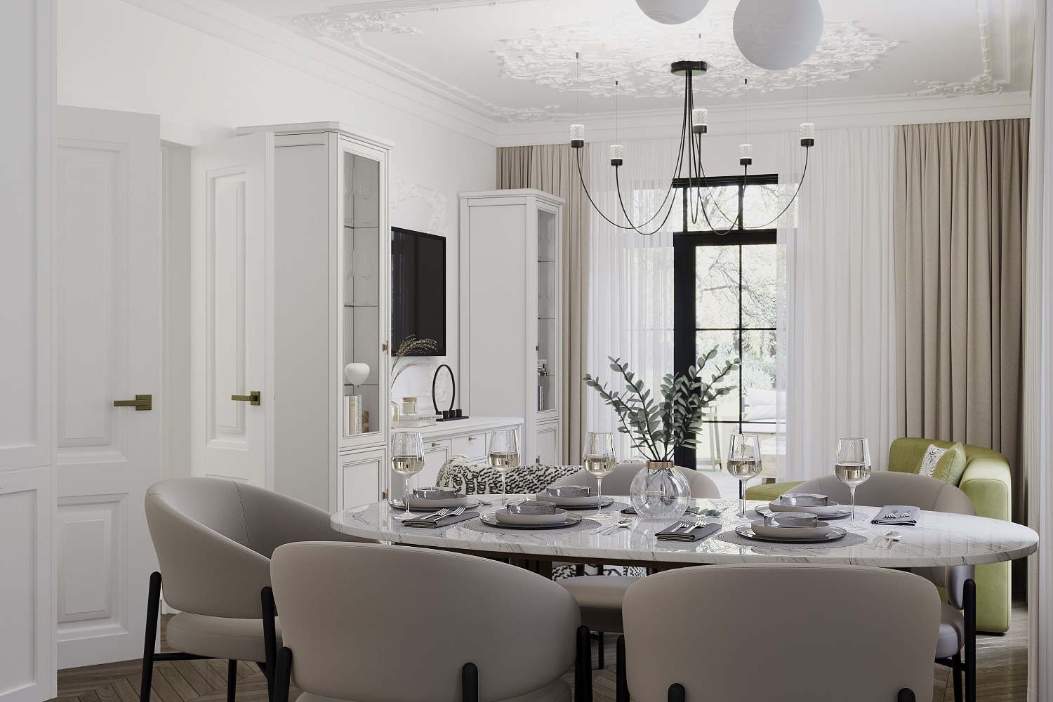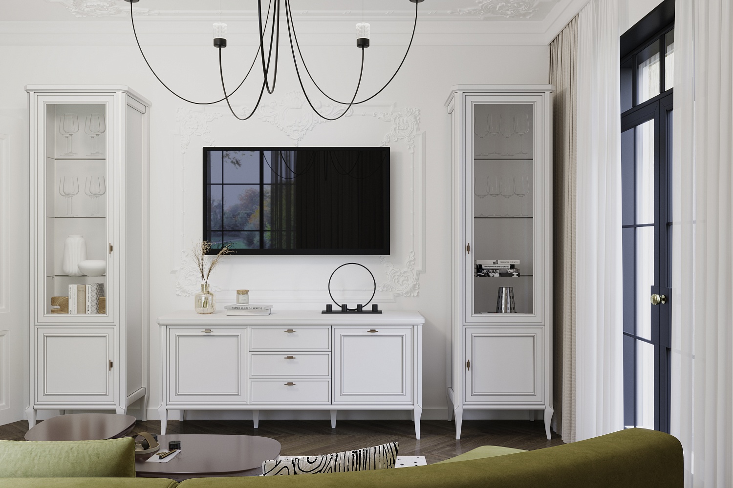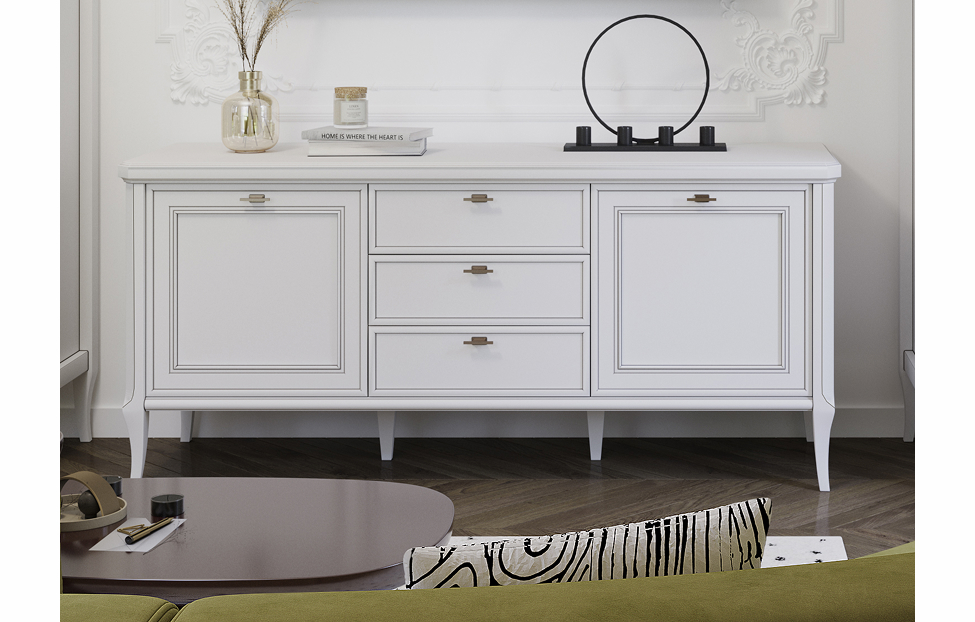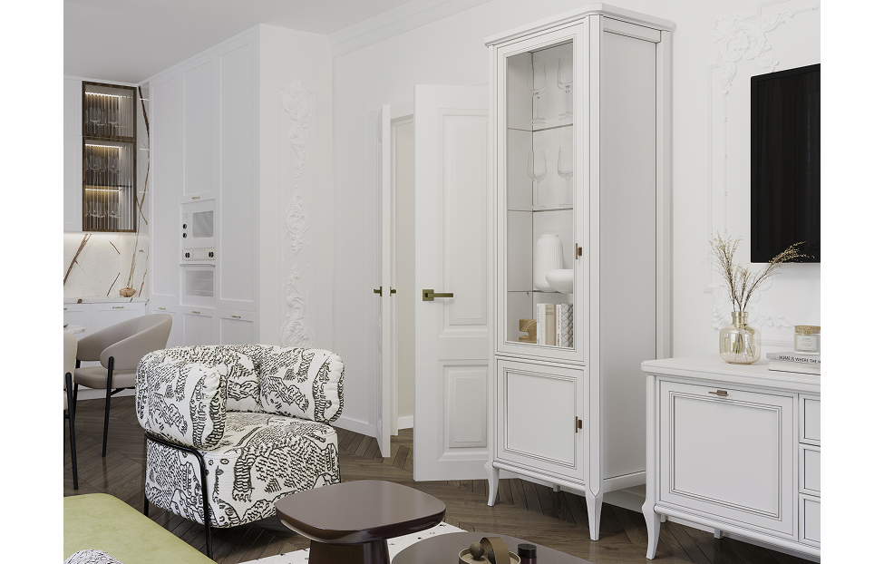 – описание: назначение для гостиной, размер 214.8x287x50.5 см, цвет бело-серый, стиль неоклассика.